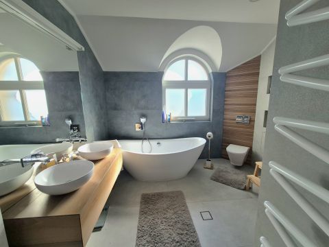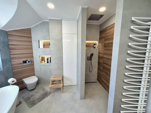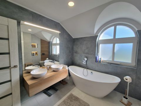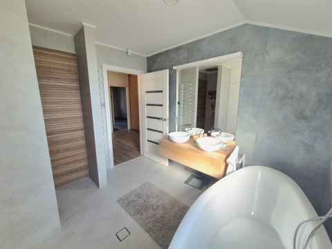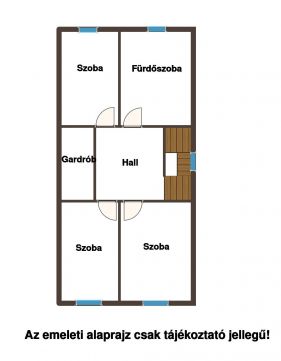 Az emeleten három hálószoba, amelyek nem csapottak, nagy kádas és zuhanyzós fürdőszoba WC-vel, valamint egy hall és egy gardróbszoba.