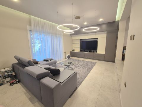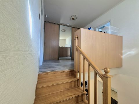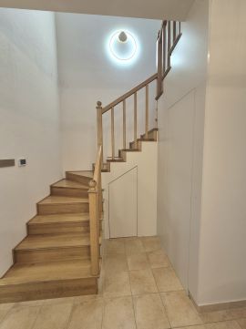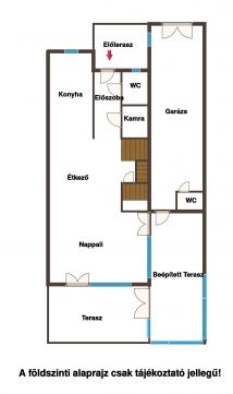 A lakás földszintjén található előszoba, WC, kamra, tároló, valamint nagy nappali, konyha és étkező egy légtérben.