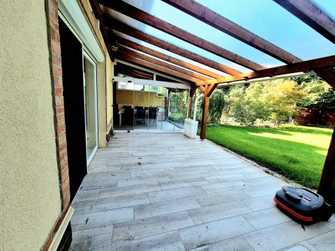 A nappaliból vagy a fedett teraszról kilépve a parkosított, 200 m2-es kert automataöntözéssel, gyönyörű növényzettel rendelkezik. Található még a kertben egy épített bográcsozó, grillező.