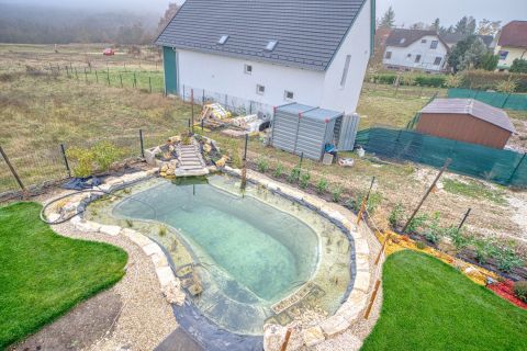 Az úszótó 6x4 méteres, kb. 100 vízi növénnyel, és csobogó vízeséssel.