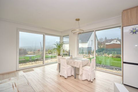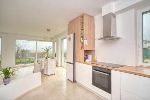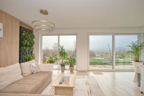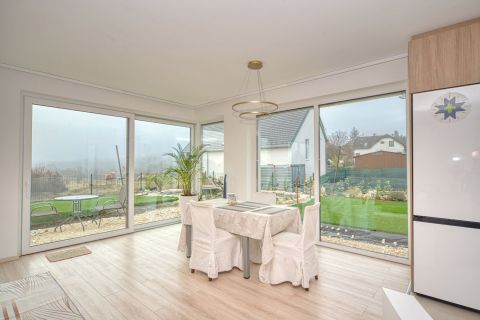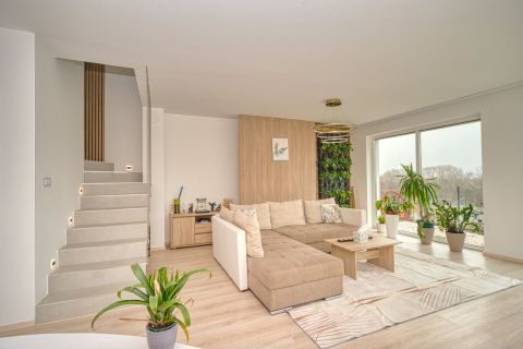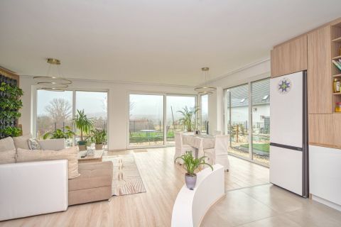 Ez a 146 négyzetméteres, modern stílusú ikerház Solymár egyik legszebb részén található, ahol a nyugalom és a zöldövezet összetalálkozik.