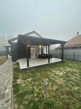 Az ingatan alapterülete 101 m2, fedett terasz 27 m2, kiváló kialakítású közös fal a szomszéddal tároló.