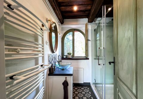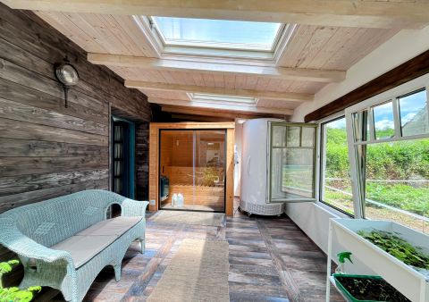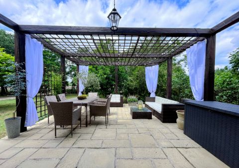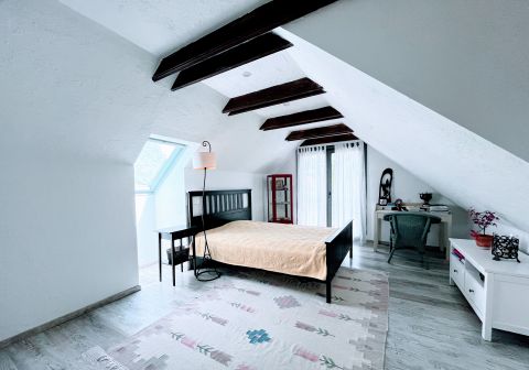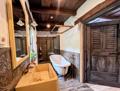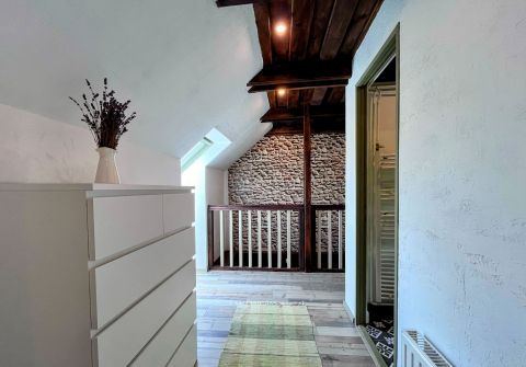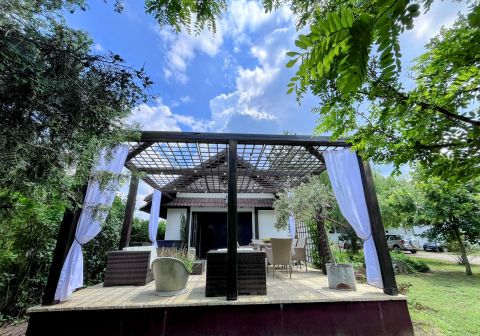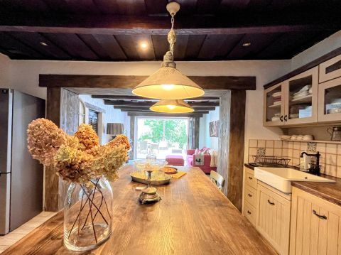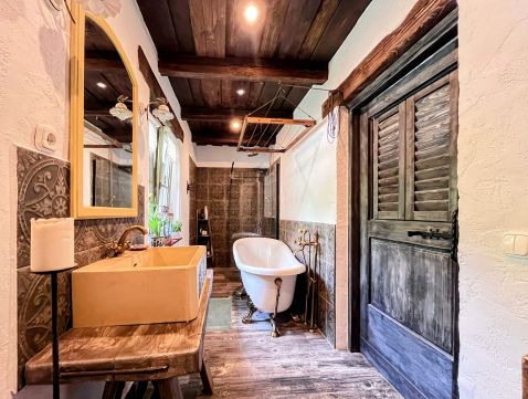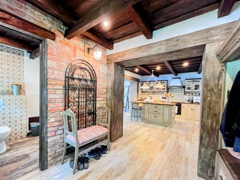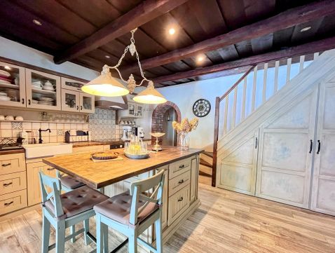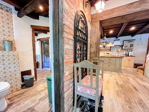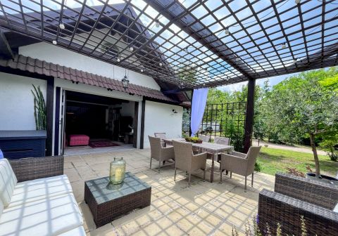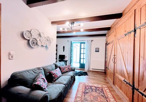 A birtok ékköve, a 150 nm-es, 2019-ben teljesen felújított családi ház, amely csodás rusztikus stílusban, mégis modern kényelmi megoldásokkal került kialakításra. A tágas amerikai konyhás nappali, a természetes fa elemek, különleges burkolatok és a kertre nyíló terasz egy igazán otthonos, meleg hangulatot teremtenek.