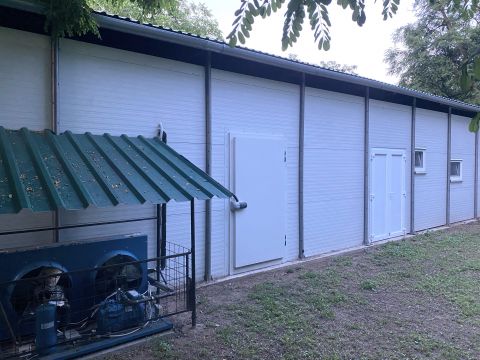 A területen található egy 2017-ben épült, 200 nm-es szendvicspanel csarnok, jelenleg is engedélyezett élelmiszer-feldolgozásra, 12 nm-es -25°C-os fagyasztókamrával. Ideális állattartásra, feldolgozásra, raktározásra, de akár műhely vagy kutyapanzió kialakítására is. Hasznosítására csak a képzelet szab határt.