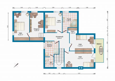 Az emelet a nyugalom és a visszavonulás tere: négy külön nyíló szoba, dolgozósarok, két fürdő és külön WC biztosítja, hogy minden családtagnak meglegyen a saját élettere. Az ablakokon és az erkélyről a Budai-hegyek látványa tárul fel csend, zöld és szabadság minden nap.