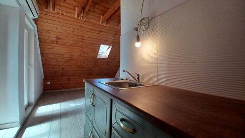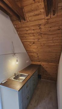 A felső szint, ami most még külön megközelíthető, TERASZ, szoba, nappali + konyha, és egy fürdő + WC található.