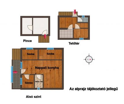 Van két szintje, egy az alsó 51nm 2 szoba, Nappali + konyha, fürdő 3 WC, előszoba.