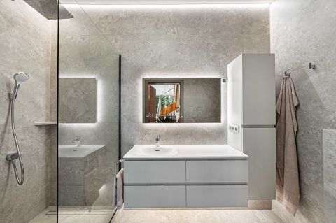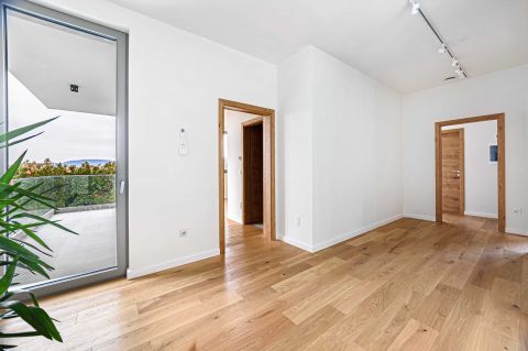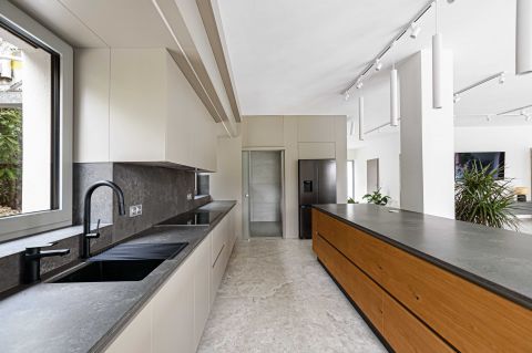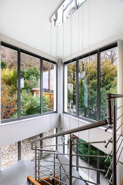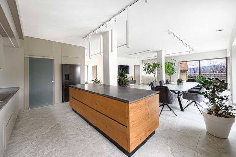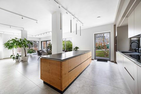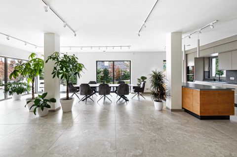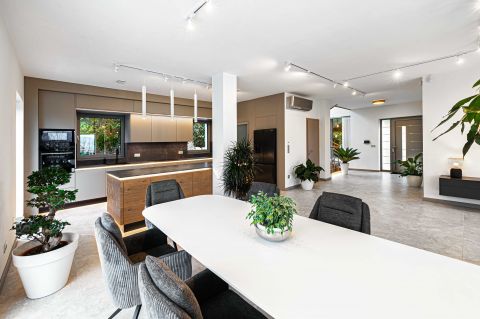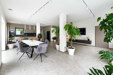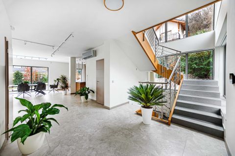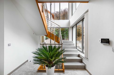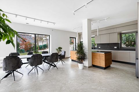 A bruttó 490 m² alapterületű, modern minimál stílusú épület tágas terekkel, nagy belmagassággal és kivételes fényviszonyokkal készült. A nappaliétkezőkonyha egység a ház szíve: a nagyméretű üvegfelületeken keresztül a környező természet szinte beköltözik a belső térbe.