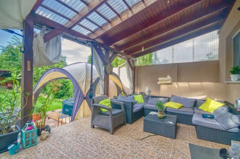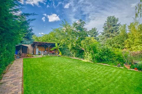 A kert ideális se kicsi se nagy, még egy kerti kiülő is megépítésre került.