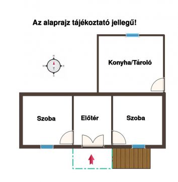 Az ingatlanban 2 szoba, előtér található, külön bejárattal egy tároló is tartozik hozzá, mely jelenleg konyhaként funkcionál.