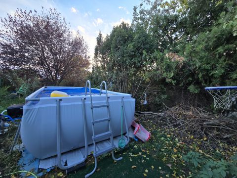 A kertben egy betonalapon álló faház segíti a tárolást, a kültéri medence pedig alku tárgya.