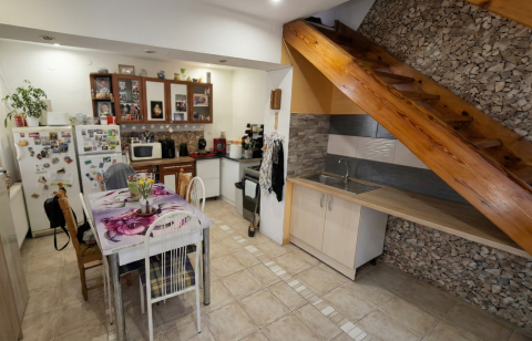 - Alsó szint: étkezős konyha