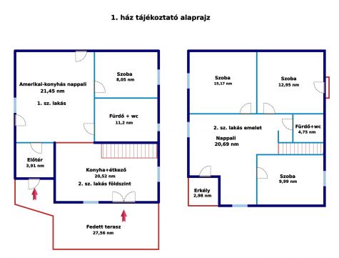 - Felső szint: nappali, három hálószoba, fürdőszoba WC-vel