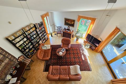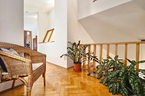 A nagy belmagasságú nappali és a galériás tér olyan tágasságot ad, ami Révfaluban is ritkaság. A ház minden szeglete fényes, jól szervezett, és természetes átmenetet teremt a kert felé, mintha a belső és külső terek együtt lélegeznének. A karakteres építészeti részletek és a korát meghaladó anyaghasználat időtálló minőséget hoznak. A ház minden elemén látszik, hogy hosszú távra, kompromisszummentesen készült.