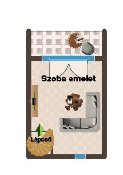 Az előtérből vezet fel a kb.12 fokos csigalépcső az emeletre. A felső szinten egy világos, hangulatos 13 m2-es szoba kapott helyet, melyhez egy 4 m2-es hangulatos, télen is védett erkély csatlakozik. Az erkélyről csodás, tiszta panoráma nyílik a környező dombokra, a városra és a kertre itt valóban meg lehet találni azt a fajta csendet, amit a városi élet mellett sokan keresnek.