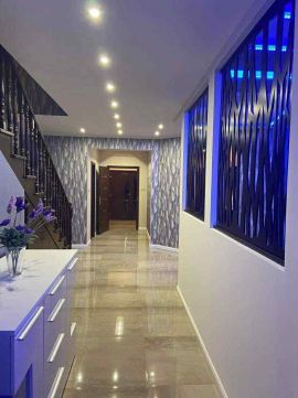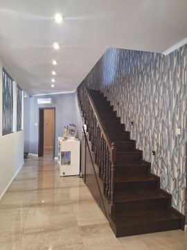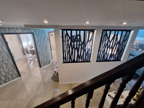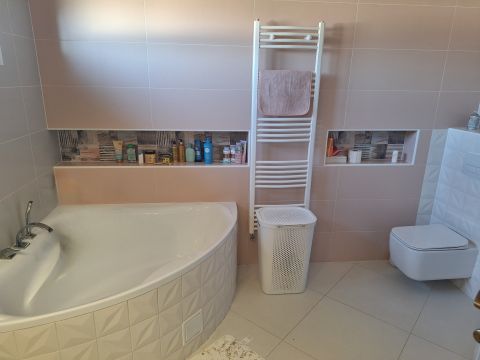 5 szobával, nappalival, 2 fürdőszobával + külön WC és praktikus háztartási helyiséggel.