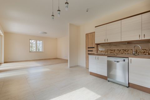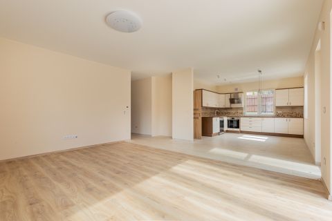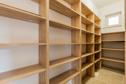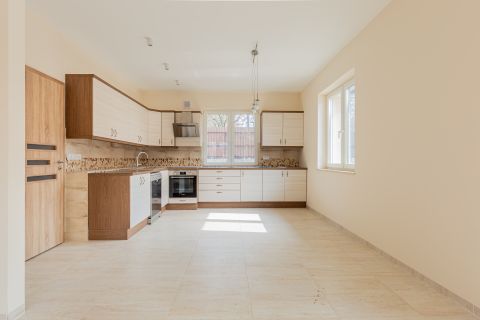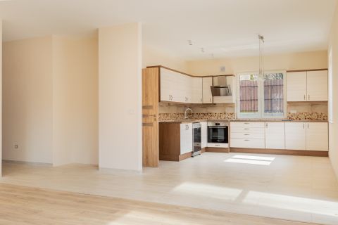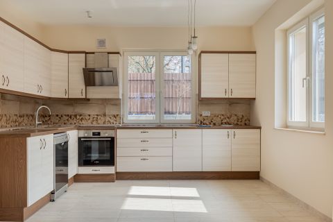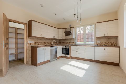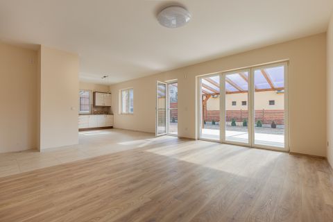 A ház központja a 46 m²-es nappaliétkezőkonyha tér, amely közvetlen kapcsolatban áll a DNY-i fekvésű, napfényes terasszal és kerttel. A tágas, kész, világos konyha egy sokpolcos kamrával kiegészítve ritka tárolási kapacitást biztosít.