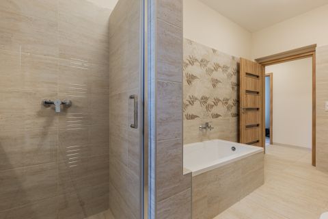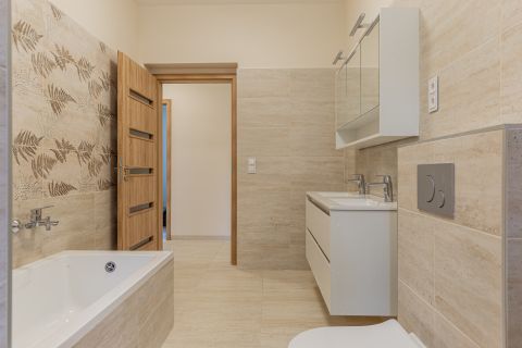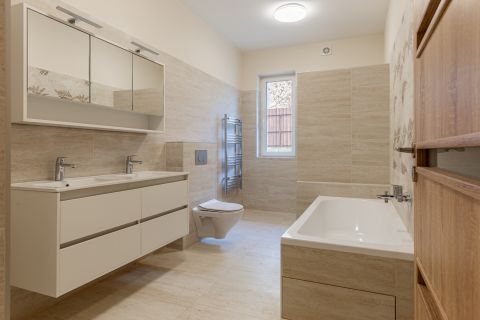 tágas fürdő (kád + zuhanyzó, dupla szaniter, helyiségen belül WC)