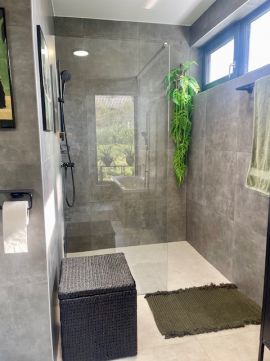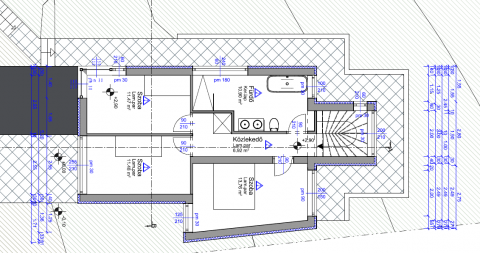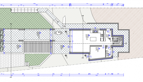* első szint: főbejárat, tágas, világos amerikai konyhás nappali, panorámás nyitott, fedett teraszokkal, TV- és pihenő rész, vendégmosdó zuhanyzóval