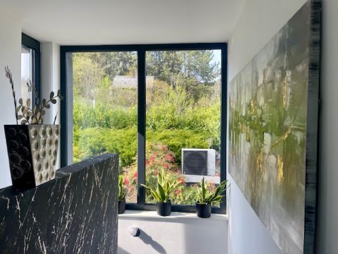 Az enteriőröket a letisztult vonalvezetés, a természetes fény bősége és a magas minőségű anyaghasználat határozza meg. A tágas, amerikai konyhás nappali elegáns központi tér, amely szinte észrevétlenül kapcsolódik a kültéri élettérhez.