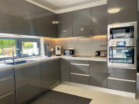 * fényes antracit szürke, teljesen felszerelt, gépesített konyhabútor