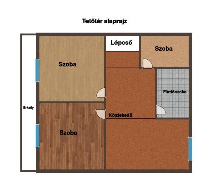 A tetőtérben további három szoba, erkély, közlekedő és fürdőszoba szolgálja a bent lakók kényelmét.