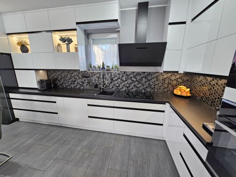 -Magasfényű, egyedileg, plafonig épített, minőségi konyhabútor (gránit mosogató)
