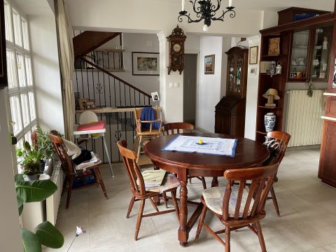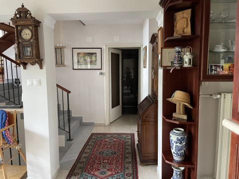Négy egységes csoportos családi ház 3. háza eladó Telkiben. A ház 1991-ben épült Radványi György Ybl díjas építész terve alapján. A csoportos elrendezésnek köszönhetően a telken belül egyéni használatú terület -elő és hátsókert ill. külön egy 448 nm-es önálló kertrész is az ingatlanhoz tartozik.