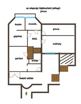 A ház bejárati és pinceszintje: 88.30 nm ebből a bejárati szint lakásterülete 7.70 nm. Ezen a szinten helyezkedik el egy fedett előtér, szélfogó, wc/kézmosóval, előtér, garázs, közlekedő, műhely, mosókonyha, kazánház és a pince.