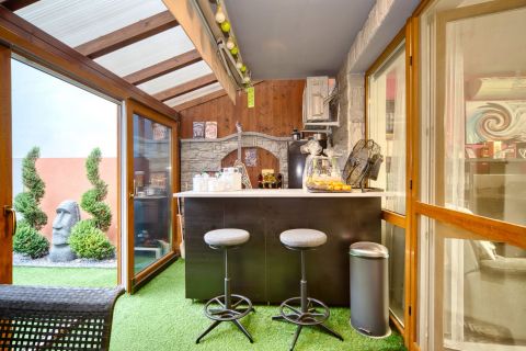 A 14 m-es hangulatos terasz télikertként funkcionál, egész éveben jól kihasználható.