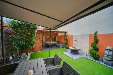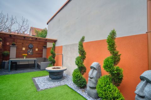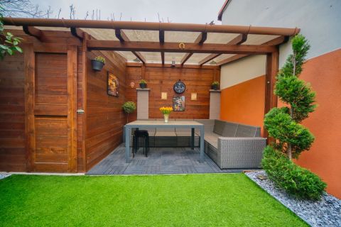 A kicsi de praktikus udvar gondozásmentes, köszönhetően a prémium minőségű műfűnek és a burkolatoknak, a teljes kert megépítése 2021-ben valósult meg, a kert végében egy tároló is helyet kapott.