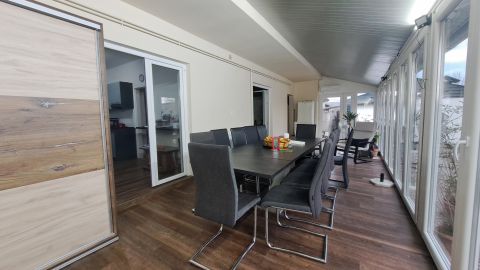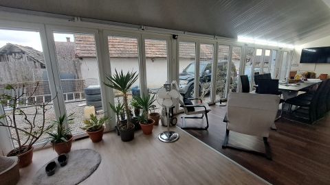 Die Raumaufteilung ist praktisch und gut nutzbar: drei Zimmer, eine Küche, ein Badezimmer, ein separates WC sowie ein großzügiger, heller Wintergarten, der zum zentralen Lebensraum des Hauses werden kann. Er eignet sich ideal für Familienzusammenkünfte, Gespräche mit Freunden oder entspannte Stunden in ruhiger Atmosphäre.