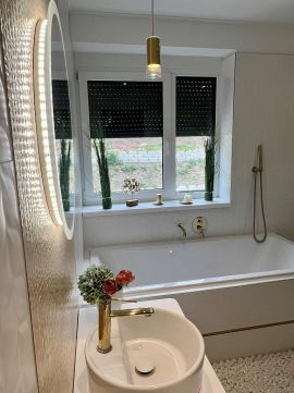Tágas fürdőszoba káddal, zuhanyzóval
