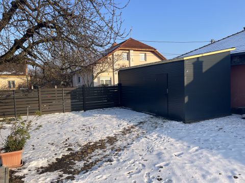 Az utcafronton egy elektromos kapuval szerelt 18 négyzetméteres garázs is épült.