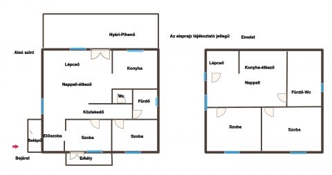 Az alsó szinten két hálószoba (az egyikhez erkély tartozik), nappali, konyha, fürdőszoba és külön WC található.
