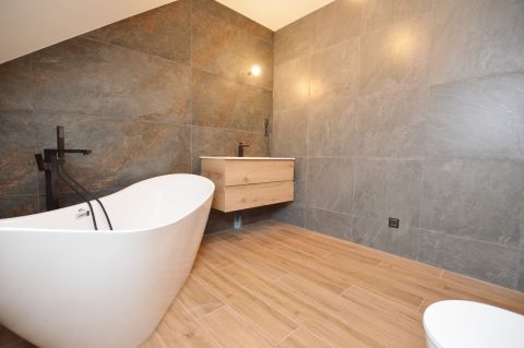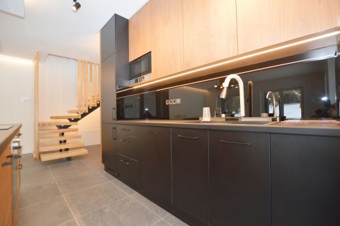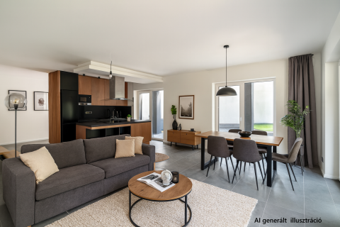 Az ikerház földszintjén egy tágas nappali-konyha-étkező található, mellyel az alsó szinten egy hálószoba és egy fürdőszoba is kapcsolódik, az emeleten további három hálószoba, egy fürdőszoba található, és lehetőség van egy terasz kialakítására is. A konyha modern Bosh berendezésekkel felszerelt, biztosítva ezzel a mindennapok kényelmét.