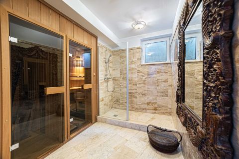 Hőszigetelt, tolóajtós nyílászárók a nappaliban, és a wellness szinten is elektromos redőnyökkel felszerelve.