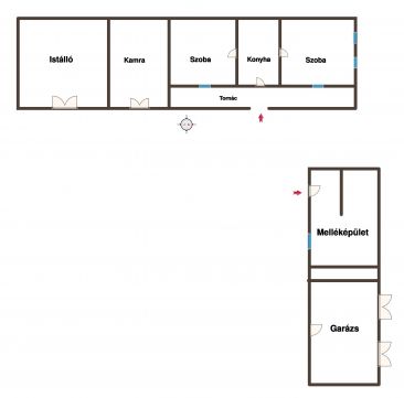 Helyiségei: 2 szoba, konyha-étkező, tornác, külön bejáratú kamra és egy műhelynek/tárolónak/garázsnak is alkalmas helyiség.