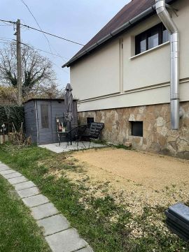 A kertben fedett tároló és kialakított pihenőrész található, amely tovább növeli a komfortot.