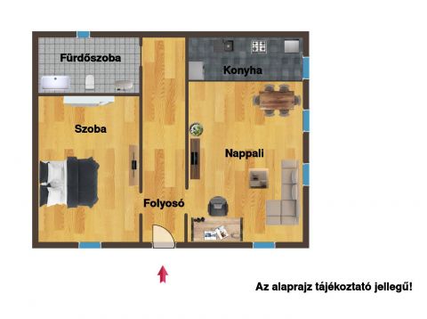 A ház elrendezése modern és praktikus: amerikai konyhás nappali, egy hálószoba gardróbbal, folyosó, valamint egy zuhanyzós fürdőszoba WC-vel került kialakításra.