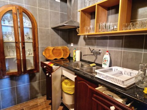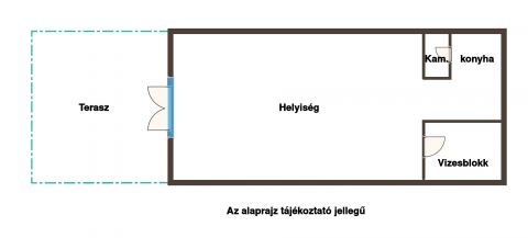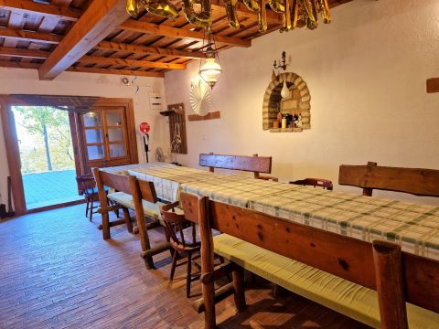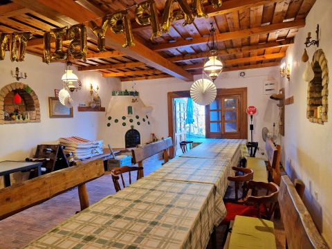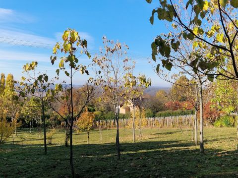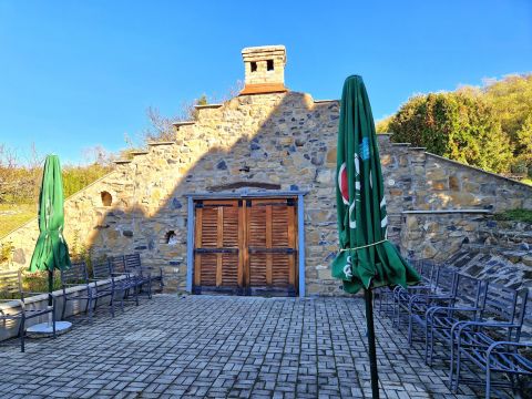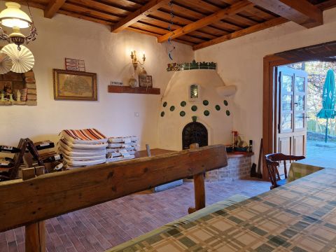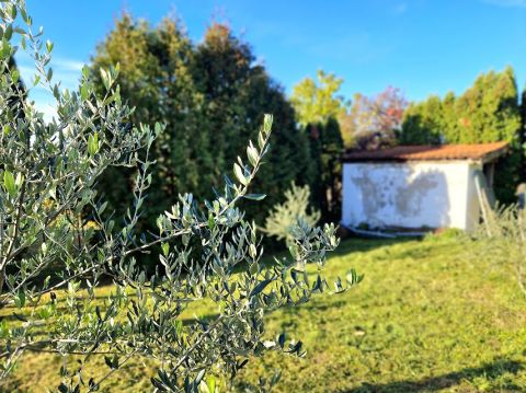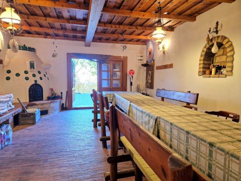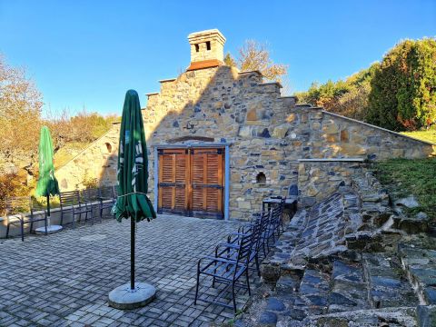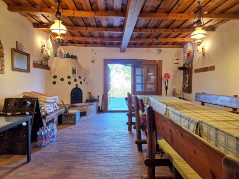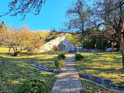 Jelenleg konyha, kamra, vízesblokk és egy nagy helyiség található benn, előtte egy 41 nm-es térkövezett terasszal került kialakításra, csodaszép természeti környezetben, tájpanorámával, császárfákkal, kb. 8 éves olajfákkal.