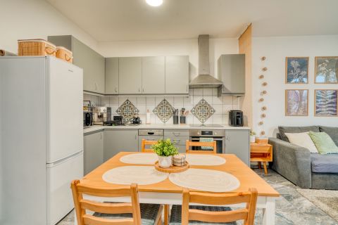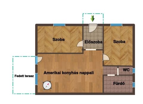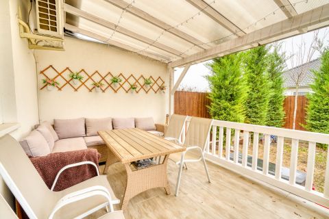 A ház elrendezése kényelmes és jól használható: amerikai konyhás nappali, két külön nyíló hálószoba, külön fürdőszoba és WC, valamint fedett terasz kapcsolódik a nappalihoz. A beépített konyhabútor gépekkel együtt, valamint a nappali és előszoba egyedi beépített bútorai a vételár részét képezik. Minden ablak szúnyoghálóval felszerelt, a nappaliban elhelyezett klíma pedig hűtésre és fűtésre egyaránt alkalmas.