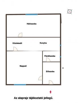 Előszoba, fürdőszoba wc-vel, konyha, közlekedő, nappali.