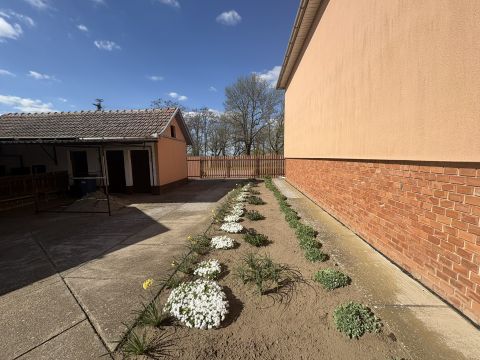 Az udvar rendezett és tágas, öntözőrendszerrel ellátott, termő gyümölcsfákkal és konyhakerttel, így a kert fenntartása is könnyedén megoldható.