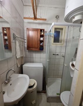 egy világos konyha, egy zuhanyzós fürdőszoba WC-vel és 2 szoba