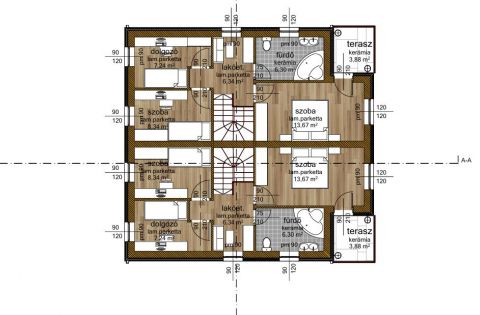 A nettó 88,5 m²-es, kétszintes lakótér átgondolt, praktikus kialakítással készül. A földszinten tágas, világos nappali, konyha-étkező és kiszolgáló helyiségek valamint egy szoba találhatók, az emeleten pedig három külön nyíló hálószoba biztosítja a kényelmes családi életteret. A két terasz további lehetőséget kínál a pihenésre, reggeli kávézáshoz vagy akár esti kikapcsolódáshoz.