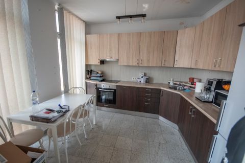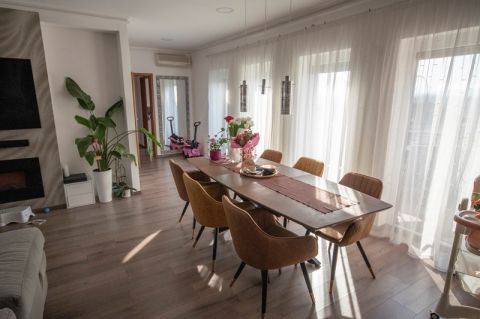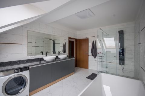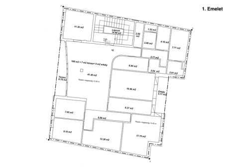 Az 1. emeleti szint 183 m2, mely egy nyugati tájolású, 7 m2-es terasszal és egy keleti tájolású 5 m2-es erkéllyel is rendelkezik. Egy 41 m2-es nagy nappali + 6 szoba, konyha-étkező, gardrób, közlekedők és vizes helyiségek találhatók benne. Gázkazán és padló fűtéses, minden szobában klíma is van. Ideális iroda-, szolgáltató-, vagy cégközpontnak.