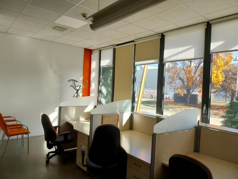- Nyílászárók: Az irodaépület utcafronti homlokzata dupla rétegű, hőszigetelt üvegfal, bukóra nyitható alumínium ablakokkal;