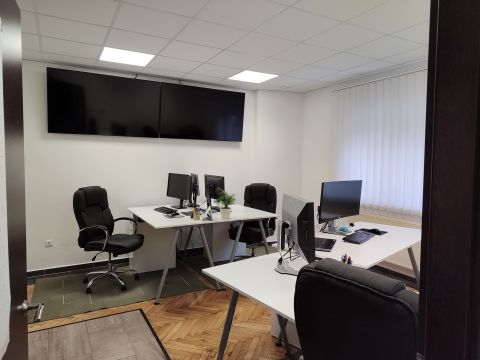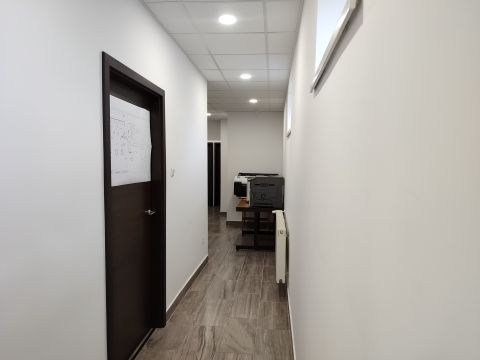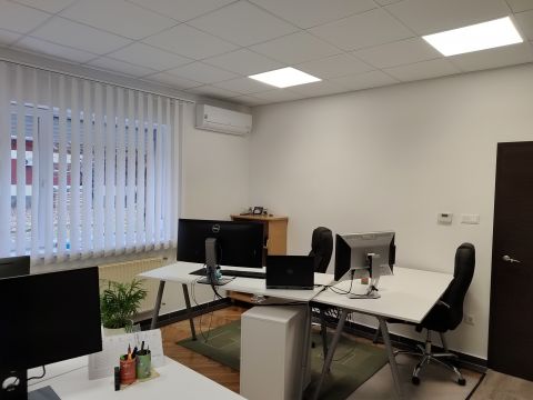Az irodai helyiségek több, külön bejáratú szobából állnak, amelyekben a berendezés tipikusan munkaállomásokból, íróasztalokból és informatikai eszközökből áll. A szobák egy részében parketta burkolat található, más helyiségek járólappal burkoltak; mindkét burkolattípus jó állapotú, repedés- és felválásmentes. A helyiségekben radiátoros fűtés biztosítja az alap hőellátást, ezt egészíti ki a helyiségenként kiépített hűtő-fűtő klímaberendezés (összesen 3 db beltéri egység 1 db kültéri egységgel), amely az épület komfortját jelentősen növeli. Az irodák nyílászárói külső oldalról műanyag ablakok, belső ajtók fa szerkezetűek, korszerű vasalatokkal, jó záródással.