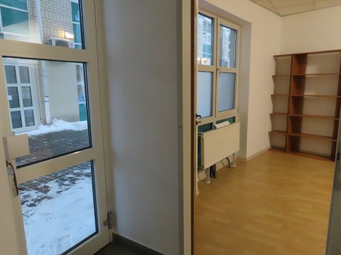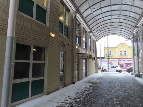 A bejárat az irodaház fedett átjárójáról nyílik, ahová az iroda ablaka is néz.
